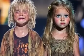 Two small children stood under the spotlight — barefoot, silent, holding hands. Tears streaked the boy’s