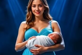 Draped in a flowing sky-blue gown, visibly pregnant and glowing under the spotlight, she stood tall —