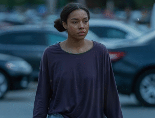 The evening air was heavy with silence as she walked across the dimly lit parking lot, her arms weighed