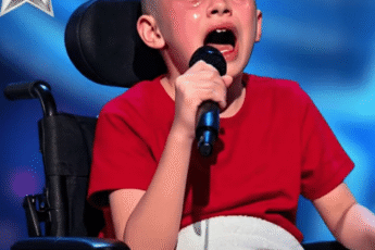 In the soft, trembling glow of the stage lights, a small girl sat in her wheelchair, gripping the microphone