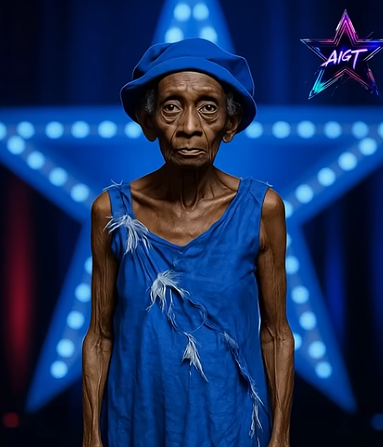An elderly woman, slender and fragile, stepped slowly into the spotlight, her frail figure wrapped in a tattered blue dress. A faded blue hat rested softly on her head, its edges worn from years of sun and rain. Her hands hung loosely by her sides, skin lined with the delicate traces of time, but her posture was straight, unwavering.