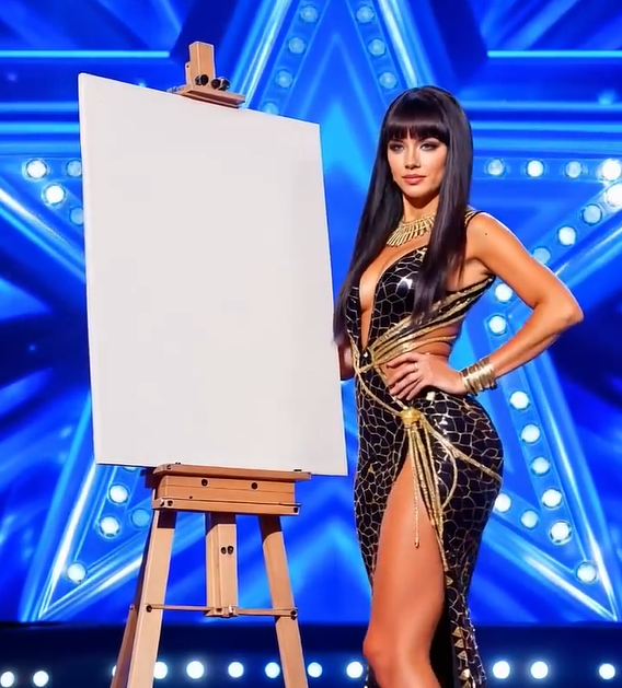 She stood beside a blank canvas under the brilliance of stage lights, dressed like a queen of contrast—sharp lines, gold glints, and purpose in her eyes. At first glance, she looked like a dancer, or maybe a magician. But beside her was only a canvas, an easel, and a silence waiting to be broken.