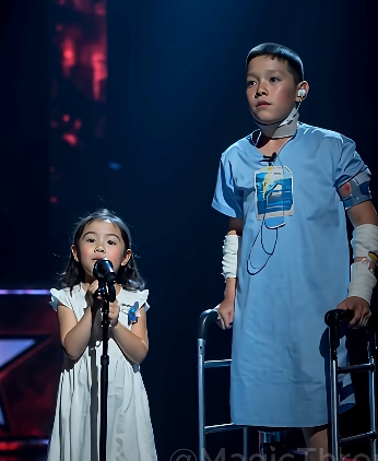 The stage lights rose to reveal two small figures—one dressed in a simple white dress, the other in a faded hospital gown, supported by a walker. A girl and her older brother stood alone in front of a hushed crowd. They were tiny, almost swallowed by the enormity of the America’s Got Talent stage, but something about their presence silenced the world.