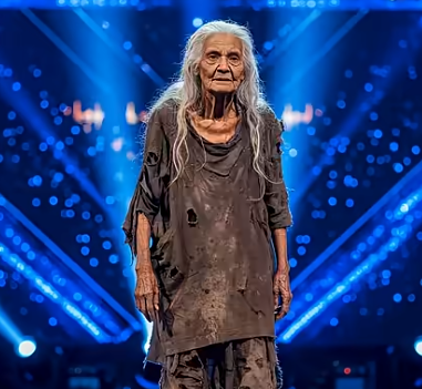 The lights dimmed, and the stage filled with a faint, misty blue glow. From the darkness, a fragile figure emerged — slow, deliberate, every step echoing through the silence. The crowd gasped softly. She was elderly, her hair long and silver, her clothes tattered, her expression unreadable.