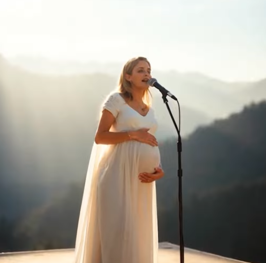 She wore a flowing white gown, simple and elegant. One hand held the microphone. The other cradled her baby bump. And then—without music, without introduction—she sang.