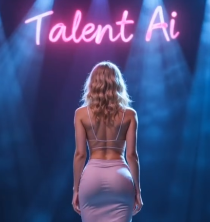 Soft blue beams crossed the air like threads of hope, and above her, glowing in pink neon, were two simple words: Talent Ai.