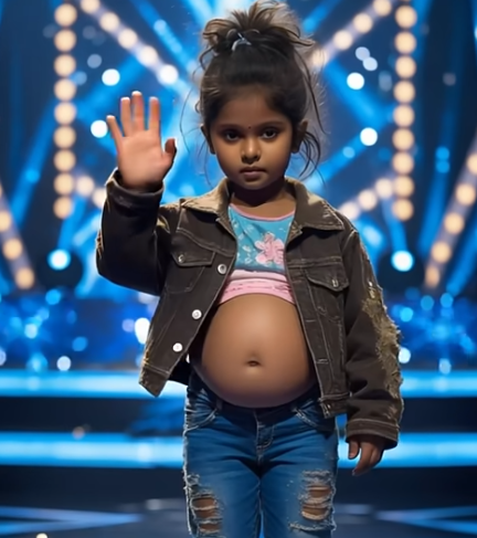 The stage lights flared bright, reflecting off the glossy floor as a hush fell over the audience. From behind the heavy curtains, a tiny figure emerged — a little girl no older than five, wearing a jacket far too big for her small frame, torn jeans, and bare feet that tapped nervously on the stage. She looked out at the sea of faces, thousands of eyes watching her, and for a moment, the weight of the world seemed too heavy for such young shoulders.