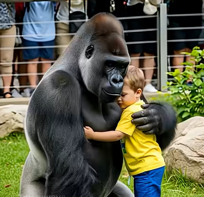 Instead of aggression, the gorilla’s movements softened. He crouched down, studying the child with a gentleness no one expected. Slowly, he extended his enormous arm, not in anger, but in protection. To everyone’s astonishment, the boy stepped closer, and in a moment that seemed to stop time, the gorilla wrapped his arm around him — not to harm, but to shield.