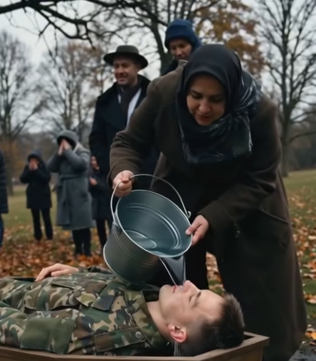 When the priest’s final words faded, she stepped forward. Her heels sank slightly into the damp grass. Every eye followed her—the grieving widow approaching for her last goodbye. But instead of leaning down to kiss her husband’s forehead, she placed the bucket beside the coffin. Her sister whispered her name, confused. “Elena, what are you—” Elena’s hands trembled slightly as she gripped the handle. The water inside shimmered with ice. And before anyone could stop her— she poured the entire bucket over Michael’s still face.