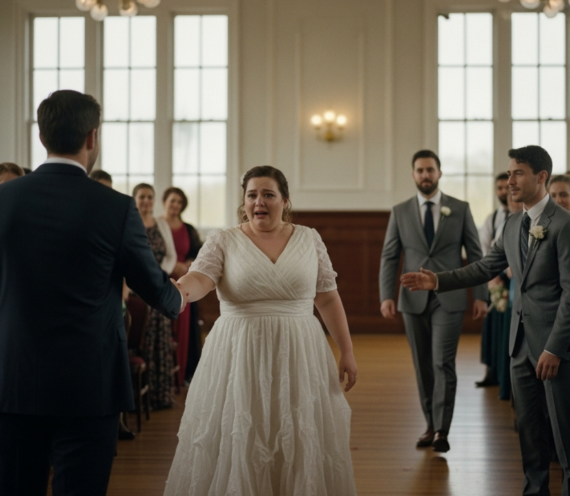 The bride stood motionless, her plus-size gown shimmering under the lights, her trembling fingers crushing the bouquet that was already falling apart.