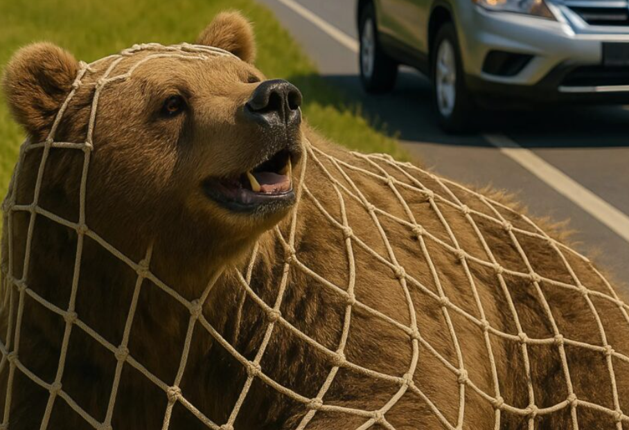 My foot pressed the gas automatically, but on a second glance I realized: the bear wasn’t just sitting — he was tangled in a large net. The ropes squeezed his shoulders and paws, his fur was clumped, the animal was breathing heavily and growling as if begging for help.