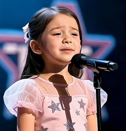 She stood on the vast stage in her soft pink dress, looking far too small for a place so big, yet there was a quiet certainty in her eyes — the kind that doesn’t come from confidence, but from love. As she gripped the microphone with her tiny hands, the hall fell into a hush, sensing that this moment meant far more to her than a simple performance. And when the music began and she whispered, “I believe in angels,” her voice wasn’t just sweet — it was trembling with truth.