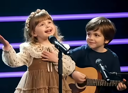 They looked like the sweetest pair—two small children standing under the bright stage lights, one holding a guitar much too big for him, and the other pressing a tiny hand to her heart as if singing was the only way she knew how to breathe. The audience smiled, expecting something cute, simple, innocent. But the moment the little girl lifted her voice and whispered, “I believe in angels,” the entire room felt something deeper—something that didn’t belong to children, yet lived inside them anyway.