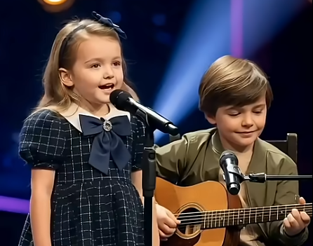 They stood together under the glowing stage lights — the little girl in her navy dress gripping the microphone with both hands, and her older brother sitting beside her, fingers gently brushing the strings of his guitar. The audience expected sweetness, innocence, maybe a charming moment to smile at. But when she took a breath, looked at her brother for courage, and sang “if you see the wonder,” something deeper moved through the room — something trembling, something true.
