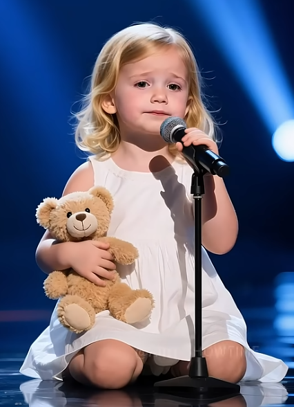 She knelt on the cold stage floor in her small white dress, clutching her worn-out teddy bear so tightly it looked like a lifeline instead of a toy. The lights were too bright, the room too big, and the silence too heavy for someone so little — yet she held the microphone with a courage that didn’t belong to a child. When she finally lifted her trembling voice, the audience felt something break inside them, because they instantly knew this wasn’t just a performance… this was a goodbye.