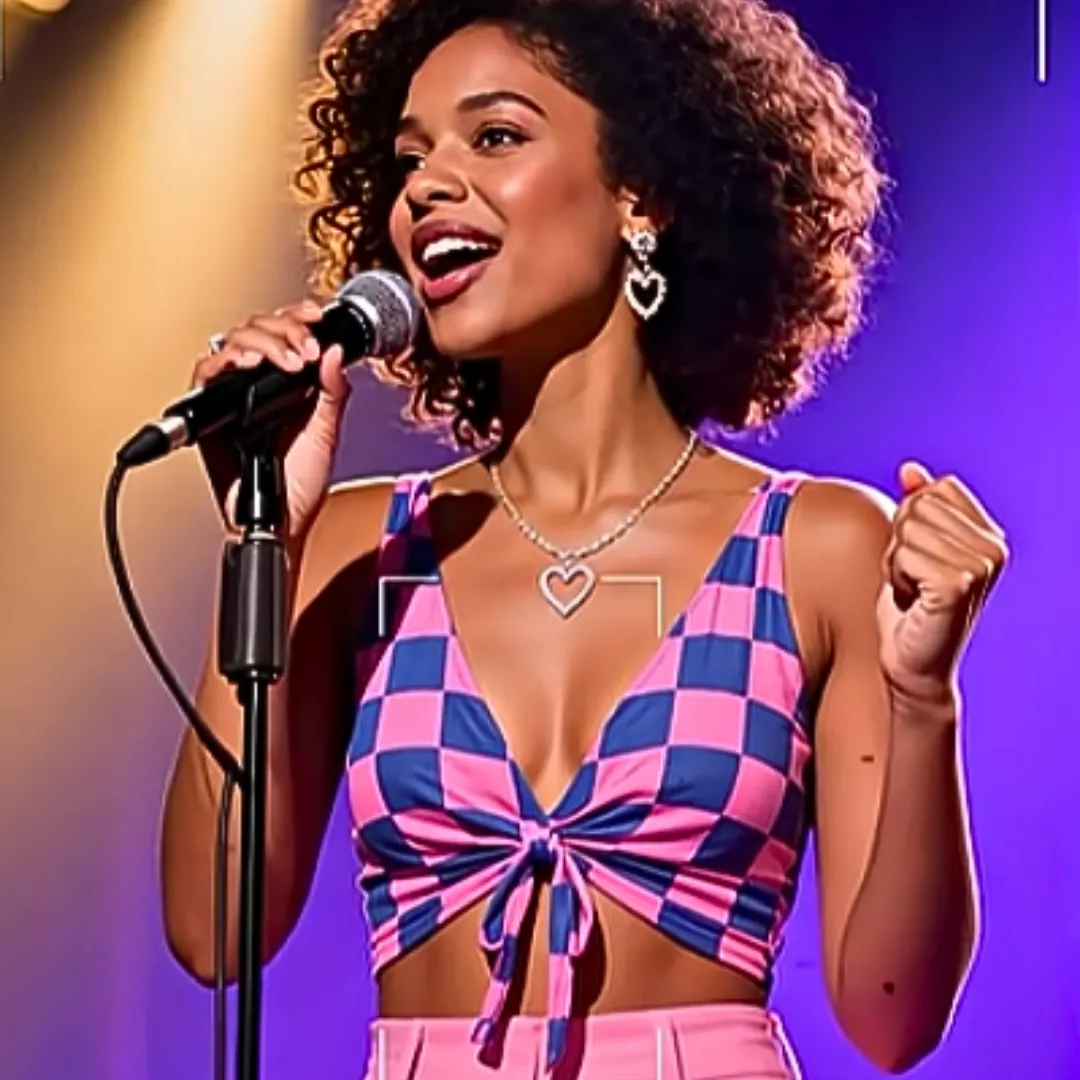 She wore a checkered pink and blue crop top paired with soft pink pants that contrasted gently with the darkened stage. Her curly hair framed her face as if echoing the freedom in her voice.