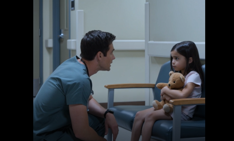 She sat alone near the door of Room 214, her small hands wrapped tightly around a worn-out teddy bear. Her eyes followed every person in a white coat who walked past, as if searching for someone.