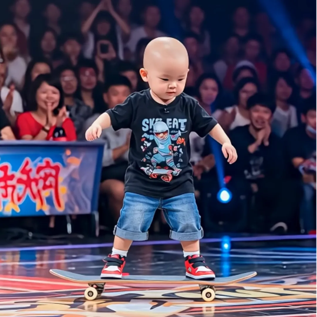 Dressed in a miniature yet professional skateboarding outfit, the young contestant rolled into the spotlight with nothing more than his board, a smile, and a quiet confidence far beyond his years. What followed was a performance that would etch his name into the hearts of millions.