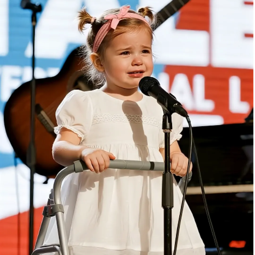 She wasn’t supposed to be walking. Not yet. Not after the accident. But there she stood—tiny hands gripping a walker, knees bandaged, heart wide open—facing a crowd of thousands and the bright lights of America’s Got Talent.Dressed in a simple white dress and a pink bow nestled in her hair, the 6-year-old girl trembled before the microphone.