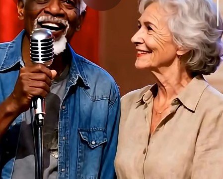 With trembling hands and a denim shirt faded by time, he stood beside her — the love of his life. Her silver hair glowed under the stage lights, her gaze fixed only on him.