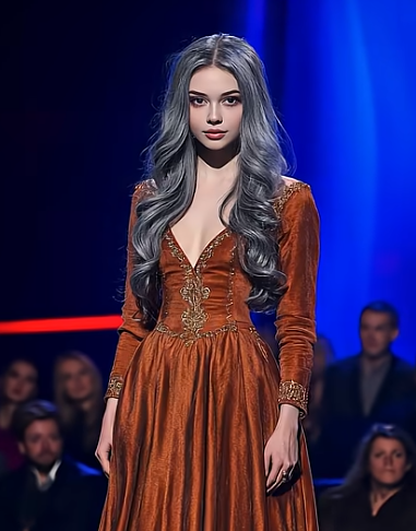 She wore a flowing gown of deep bronze, its fabric shimmering like firelight. Her silver hair fell in long waves over her shoulders, framing a face that seemed carved from marble. For a moment, she stood in perfect stillness—elegant, haunting, and utterly mesmerizing.