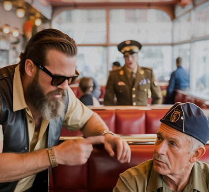 A group of bikers walked in, their leather jackets loud, their laughter louder. Most patrons glanced up briefly before returning to their meals—but one biker stopped, staring at the elderly man at the counter. He walked over, towering above the veteran, his sunglasses hiding his expression.